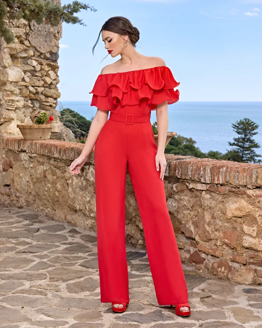 Fluid green georgette jumpsuit with asymmetrical neckline and angel sleeves, draped belt with buckle and column legs.