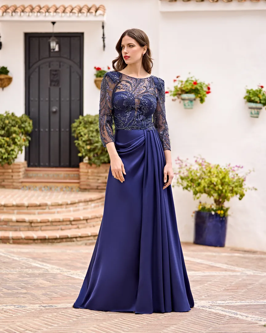 Long dress with asymmetrical hem and suggestive opening made in crepe. Raglan sleeves with French length and boat neckline accompanied by a beautiful flower created in the same fabric.
