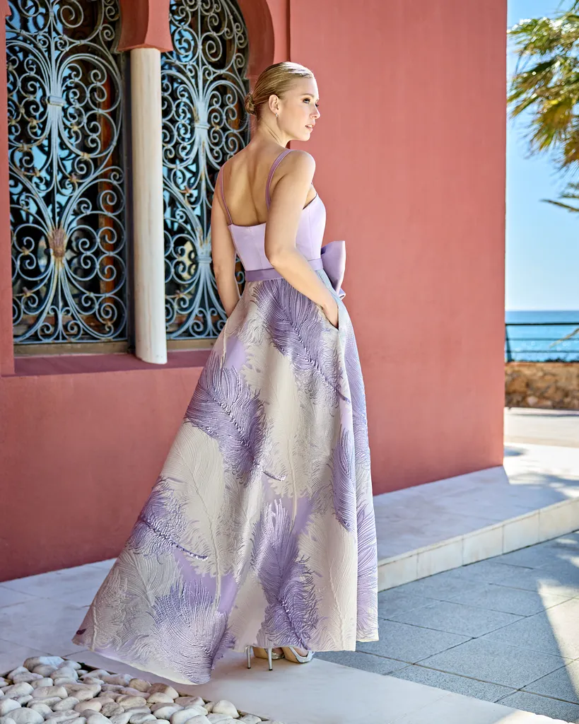 Abito midi in raso crepe abbinato a tessuto divaricato, con scollatura dritta senza spalline, allacciatura strutturata in vita e gonna ampia con tasche.