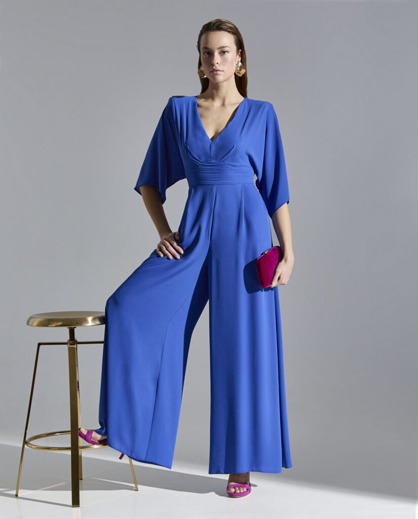 Mono largo en georgette con escote en pico que realza el pecho, mangas amplias fluidas , cintura plisada y pantalón palazzo