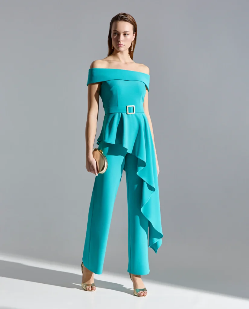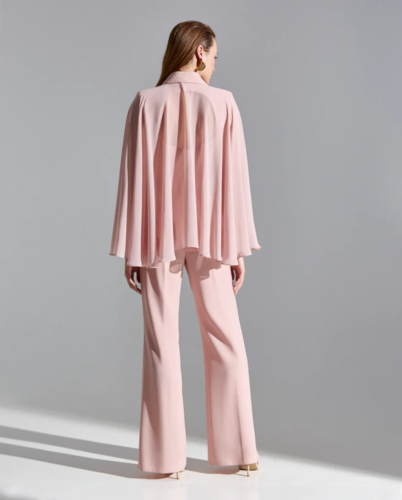 Conjunto de chaqueta y pantalon en crep con solapas, cierre frontal con botones decorativos y capa de gasa incorporada.